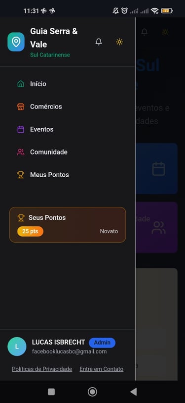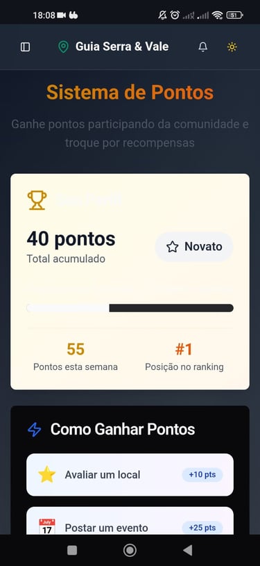 Sistema de Pontos – ganhe pontos ao interagir (postar, avaliar, curtir, etc.) e troque por cupons e benefícios locais.